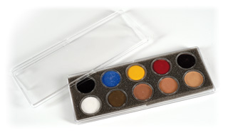 * Composition de la palette fards crèmes : noir - blanc - jaune - rouge - bleu – rouge-sang - kaki - chair clair - chair moyen - chair foncé.